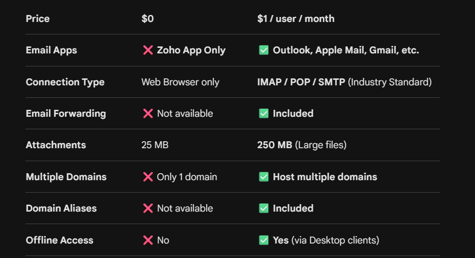 Note: The Free Plan is "Web-Only," meaning you cannot use it with the mail app already on your phone or computer. To use Outlook or Apple Mail, Zoho requires the Mail Lite plan.