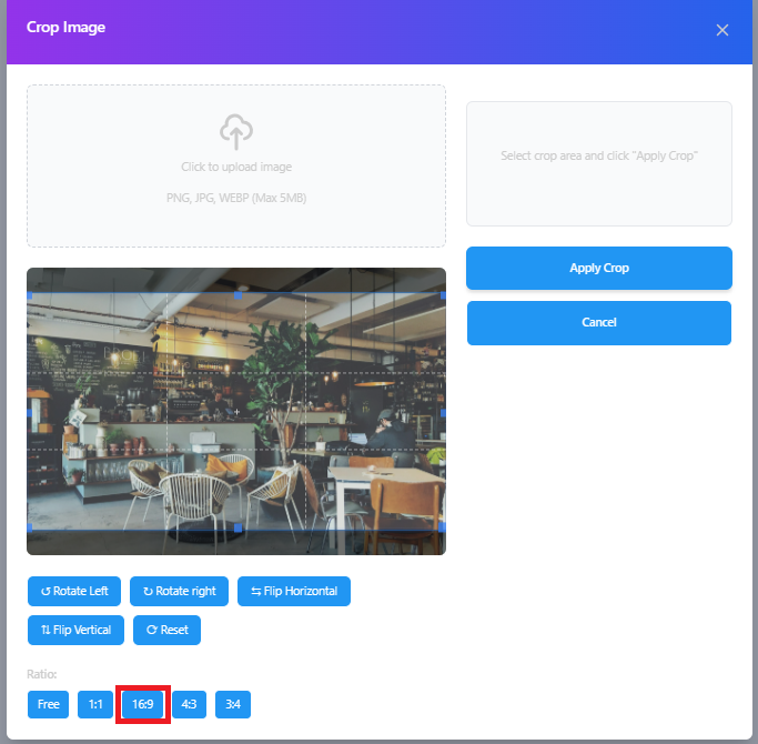 After adjusting the crop area to your liking, click Apply Crop. Your image is now ready and will be automatically placed into the image holder on your website.